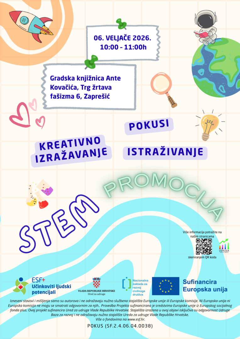 Dana 6. veljače od 10 do 11 sati u Gradskoj knjižnici Ante Kovačića u Zaprešiću, na adresi Trg žrtava fašizma 6, održat će se promocija projekta Pokus, gdje će djeca i roditelji moći saznati više o našim radionicama, pristupu radu i dobrobitima STEM programa za razvoj djece.