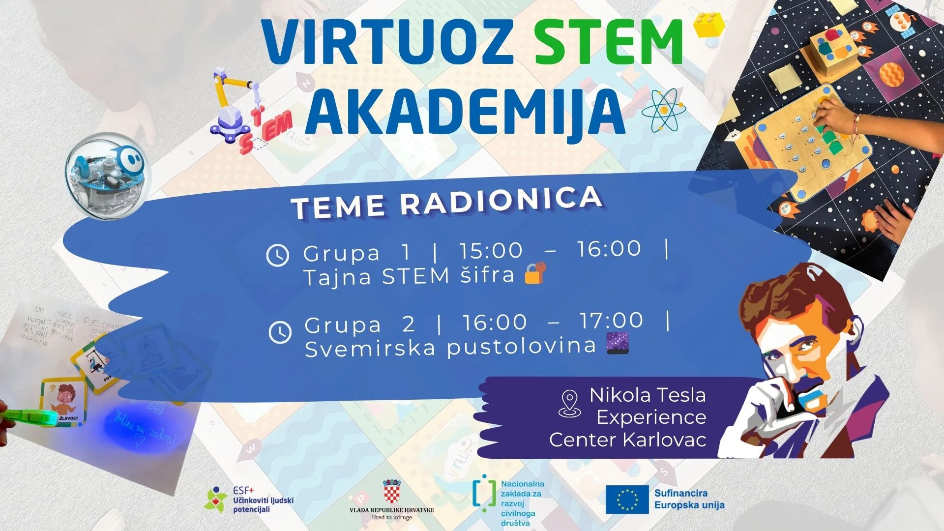 U suradnji s Nikola Tesla Experience Centrom Karlovac, u sklopu projekta VIRTUOZ STEM AKADEMIJA (SF.2.4.06.04.0078), 24. travnja održat će se dvije besplatne STEM radionice za djecu školskog uzrasta.