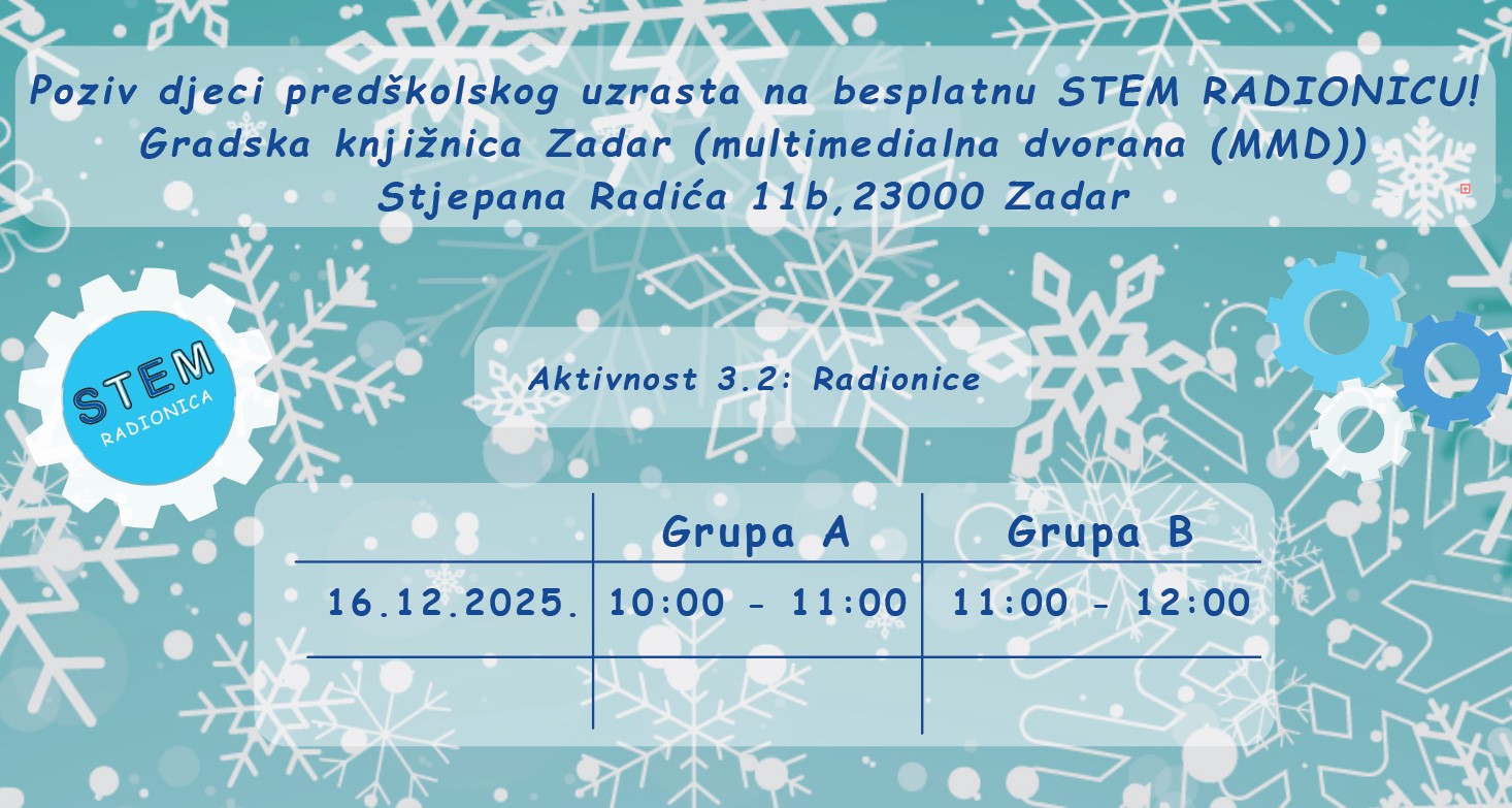 Radionice su namijenjene djeci predškolskog uzrasta. Djeca će imati priliku istražiti svijet znanosti i tehnologije kroz praktične aktivnosti, zabavne eksperimente, gradnju konstrukcija i logičke zadatke.