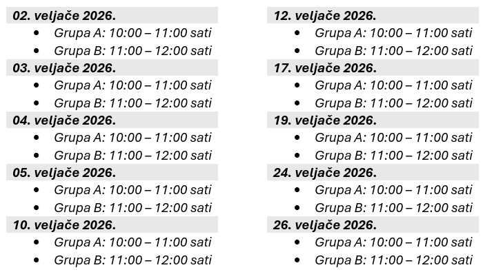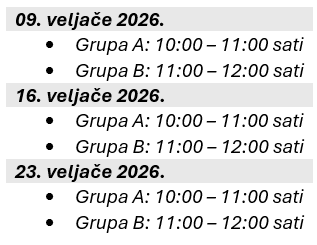 Nakon što prikupimo podatke o zainteresiranim polaznicima oformit će se skupina za pojedine radionice sa datumima i lokacijama, a o čemu ćete biti pravovremeno obaviješteni.