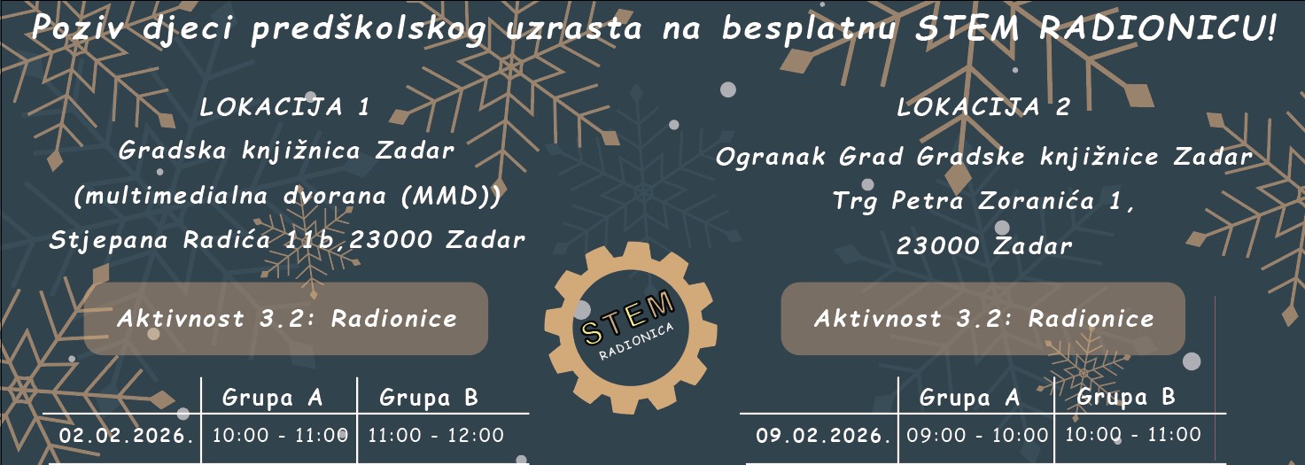 Radionice su namijenjene djeci predškolskog uzrasta. Djeca će imati priliku istražiti svijet znanosti i tehnologije kroz praktične aktivnosti, zabavne eksperimente, gradnju konstrukcija i logičke zadatke.