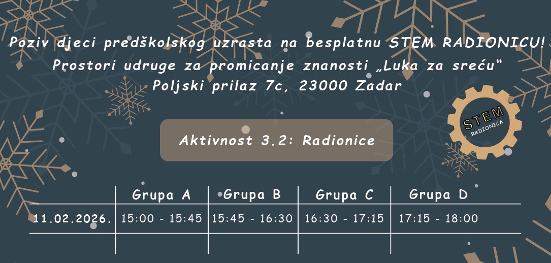 LOKACIJA: Prostori udruge za promicanje znanosti „Luka za sreću“ – Poljski prilaz 7c, 23000 Zadar