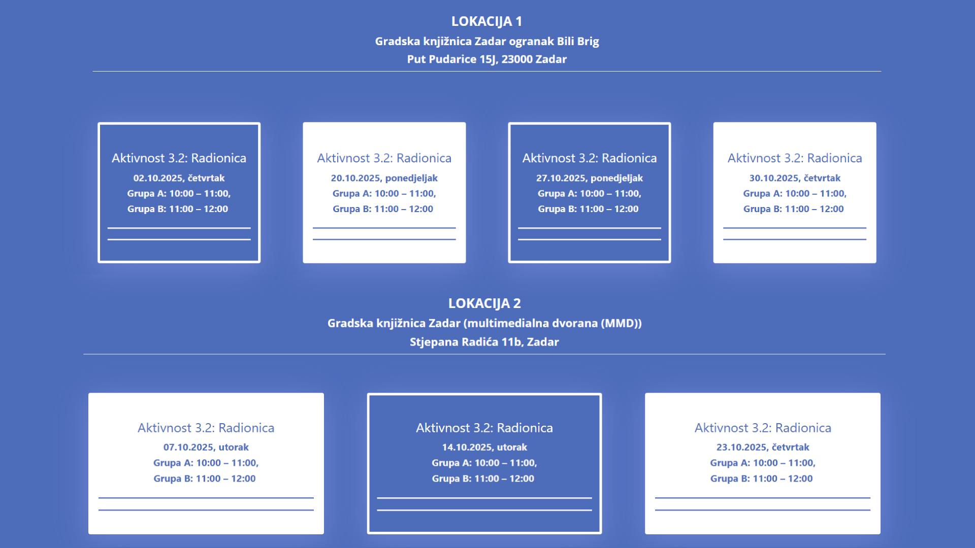 Nakon što prikupimo podatke o zainteresiranim polaznicima oformit će se skupina za pojedine radionice sa datumima i lokacijama, a o čemu ćete biti pravovremeno obaviješteni.