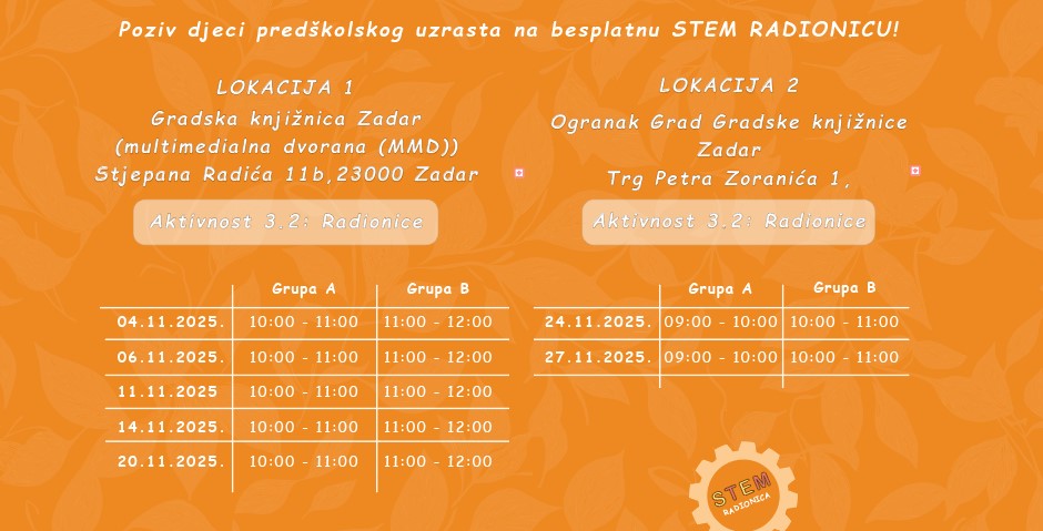 Radionice su namijenjene djeci predškolskog uzrasta. Djeca će imati priliku istražiti svijet znanosti i tehnologije kroz praktične aktivnosti, zabavne eksperimente, gradnju konstrukcija i logičke zadatke.