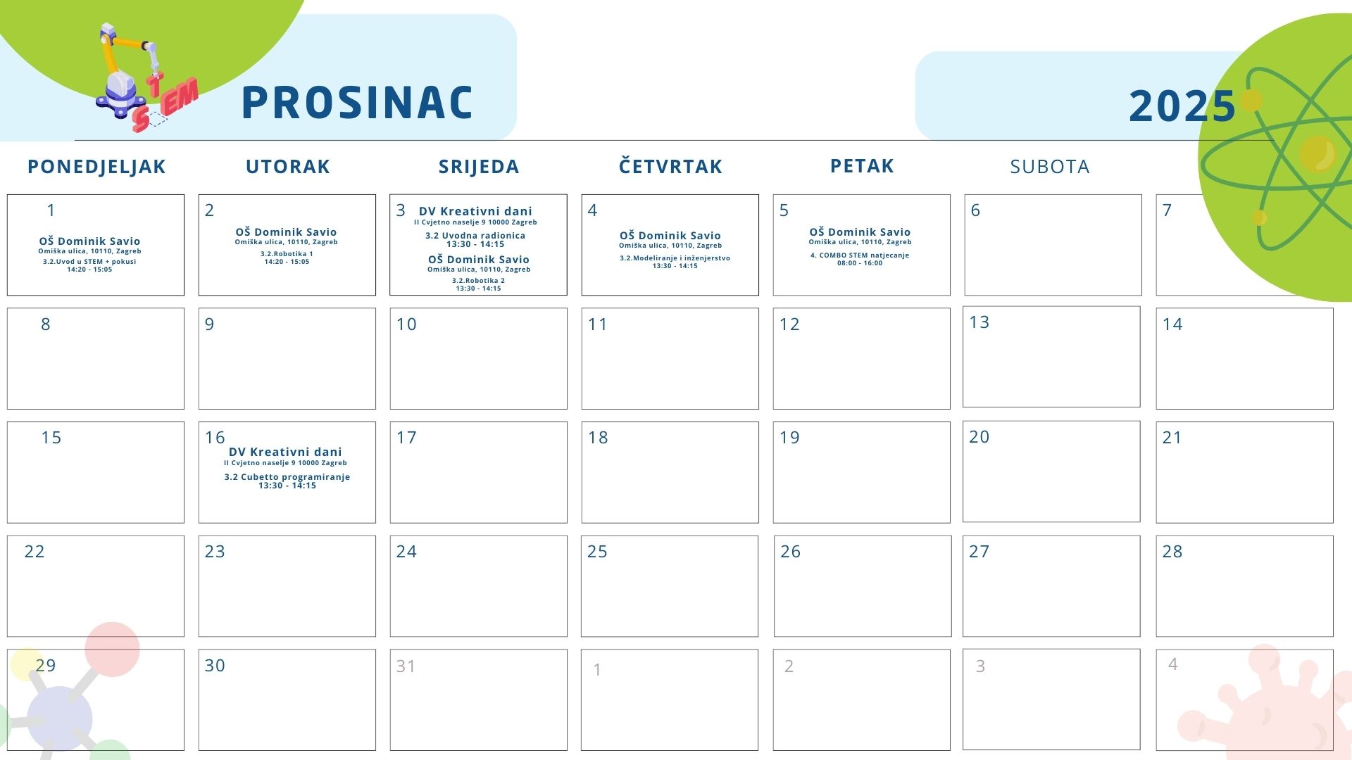Nakon mjeseci punih eksperimenata, otkrića i timskog rada, naši STEM polaznici u prosincu nastavljaju istraživati svijet znanosti – i to prije nego što započnu zasluženi blagdanski odmor. Čeka nas još nekoliko radionica u kojima ćemo kroz igru, kreativnost i praktične izazove zakoračiti u nova mala znanstvena otkrića.