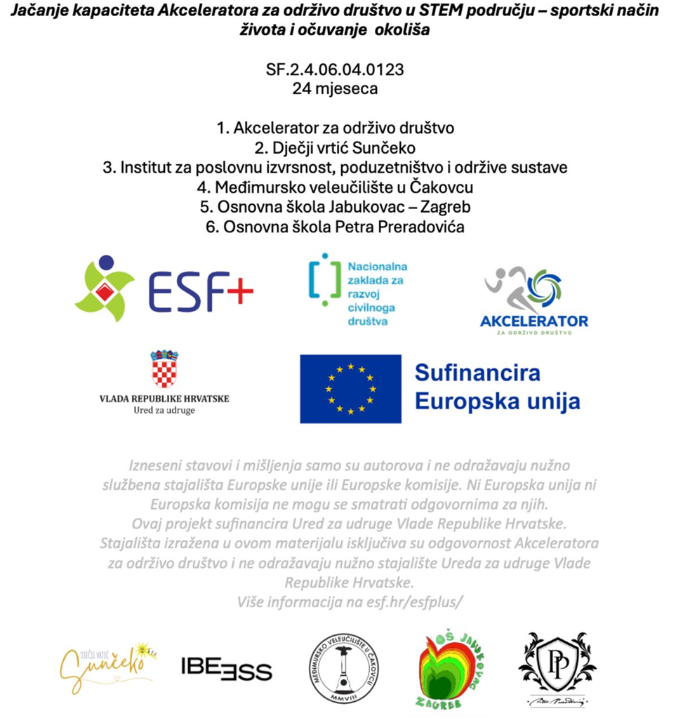 Udruga Akcelerator za održivo društvo poziva djecu da se prijave na STEM radionice u OŠ Petra Preradovića – Zagreb u sklopu projekta “Jačanje kapaciteta Akceleratora za održivo društvo u STEM području – sportski način života i očuvanje okoliša” kojeg sufinancira Europska unija, a kojeg provodi zajedno s partnerima OŠ Jabukovac – Zagreb, OŠ Petra Preradovića – Zagreb i Dječji vrtić Sunčeko u vremenskom periodu od ožujka 2025. godine do ožujka 2027. godine usmjerenom na popularizaciju STEM područja među djecom i mladima povezivanjem znanosti sa sportskim aktivnostima i očuvanjem okoliša.